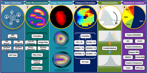 A total of 200 patients (50% normal and 50% abnormal) including rest and stress (without attenuation and scatter corrections) MPI-SPECT images were included. Images were reconstructed using 15 combinations of filter cut-off frequencies, filter orders, filter types, reconstruction algorithms, number of iterations and subsets resulting in 6000 images. Image segmentation was performed on the left ventricle in the first reconstruction for each patient and applied to 14 others. A total of 93 radiomic features were extracted from the segmented area, and ComBat was used to harmonize them. The intraclass correlation coefficient (ICC) and overall concordance correlation coefficient (OCCC) tests were performed before and after ComBat to examine the impact of each parameter on feature robustness and to assess harmonization efficiency. The ANOVA and the Kruskal–Wallis tests were performed to evaluate the effectiveness of ComBat in correcting feature distributions. In addition, the Student’s t-test, Wilcoxon rank-sum, and signed-rank tests were implemented to assess the significance level of the impacts made by each parameter of different batches and patient groups (normal vs. abnormal) on radiomic features.